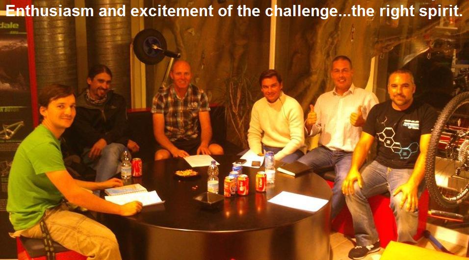 Los primeros pasos. The first steps are taken. From left to right, Jose Manuel de Greenrider, David of Pumori, Herbert Neumann, Carlos Nuñez, Deputy Mayor of Tarifa and Henk of MtbTarifa. Nacho Trujillio of TarifaActiva could unfortunately not be present.